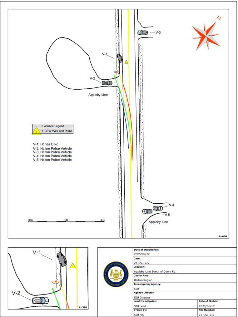 At 4:24 a.m., the Honda, followed by SO #1, WO #1 and WO #5, approached the roundabout at Appleby Line and Britannia Road. WO #2’s cruiser was stopped at the roundabout.