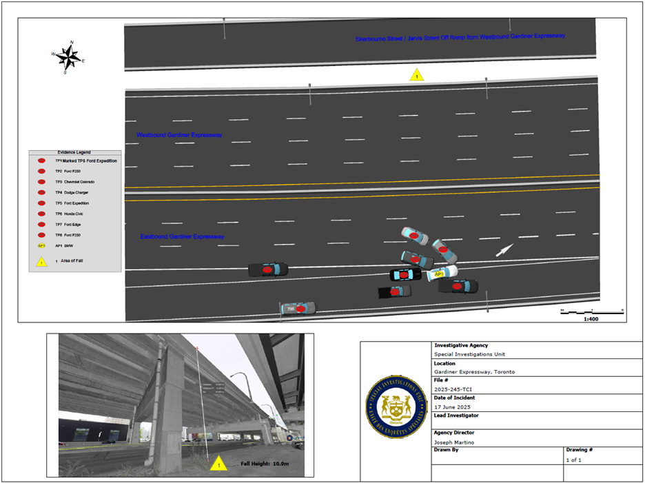 On June 16, 2025, at 11:08 p.m., TPS were informed of an attempted carjacking on Northtown Way, Toronto. Several males had reportedly fled the area in a white BMW X5 following the unsuccessful carjacking. Shortly after, a second carjacking, involving the same individuals, was reported in the area of the Shops at Don Mills, Toronto. A Rolls Royce vehicle had been stolen, and both the Rolls Royce and BMW X5 fled the scene. TPS plainclothes officers located the vehicles travelling in tandem southbound on the Don Valley Parkway onto the westbound Gardiner Expressway. Shortly before midnight, both vehicles exited the Gardiner Expressway at Spadina Avenue, before immediately getting back on. Officers initiated a traffic stop, blocking both vehicles. At 11:59 p.m., the Rolls Royce broke free of the roadblock and fled. The lone occupant of the BMW, the Complainant, exited the BMW and ran from the vehicle. A short foot chase ensued, which ended after the Complainant jumped over the guardrail of the Gardiner Expressway and fell to the roadway below, Lake Shore Boulevard, near Small Street. Emergency Medical Services (EMS) attended and transported the Complainant to St. Michael’s Hospital (SMH). He was diagnosed with fractures to both legs.