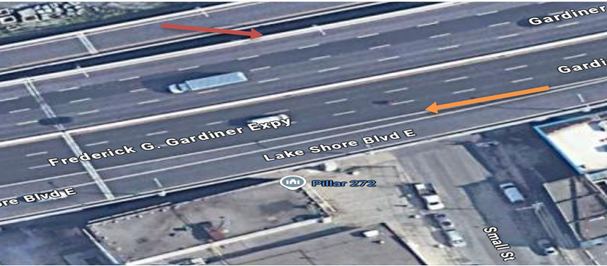 The Gardiner Expressway was a multi-lane highway oriented in a general east-west direction. The events in question began on the eastbound lanes of the highway, above Small Street, and continued in a northern direction across all lanes of traffic to the far north barrier.