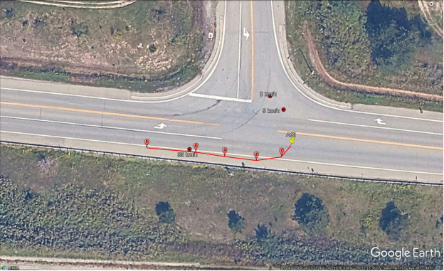Autour de 21 h 33 min 0 s, la voiture de police s’est placée partiellement sur l’accotement du côté droit de la route 58A, près de l’intersection avec Reaker Road. Cette dernière route comportait une voie réservée pour les virages à gauche. La moitié de la voiture de police a pénétré dans l’accotement du côté droit, près de la fin de la voie réservée aux virages à gauche.