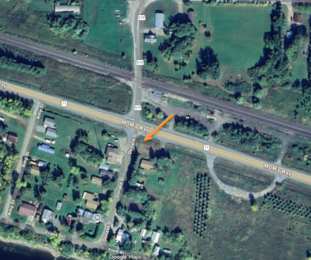 La camionnette volée s’est immobilisée dans un fossé à la jonction de la route 11 avec la rue Donald, à l’endroit indiqué par la flèche orange sur l’image ci-dessous.