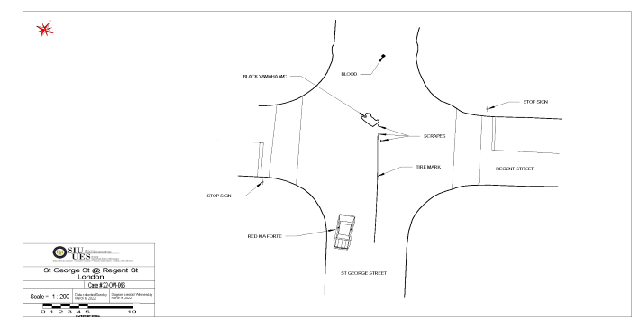 The SO followed northwards on St. George Street past the intersection, scanning the side streets to try to re-locate the motorcycle. As he reached Cheapside Street, the officer could see in the distance the motorcycle lying on the roadway at the intersection of St. George Street and Regent Street. He continued to the intersection and observed that a collision had taken place.