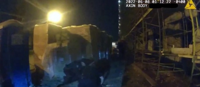 On June 8, 2022, beginning at 12:59 a.m., a break and enter in progress was reported to the TPS by a security company. The security staff was watching events on a live stream and could see a person - now known to be the Complainant - who had entered a fenced building construction site. The Complainant was rummaging through unknown items and had entered a portable toilet.TPS dispatched SO #1, SO #2, WO #1, WO #2 and WO #3.