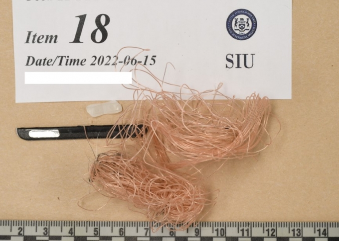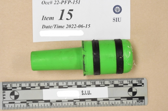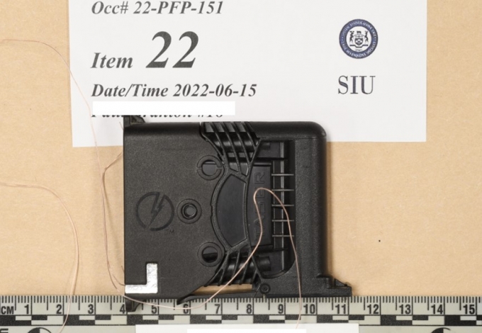 On June 11, 2022, at 11:05 a.m., a SIU forensic investigator arrived at the scene - a residence in Penetanguishene. Inside the side entrance door were stairs, which led to the basement. At the top of the stairs was a clear police shield, three ARWEN cartridges and one ARWEN projectile. Two additional ARWEN projectiles were found on the stairs. There was also evidence that a Controlled Energy Weapon (CEW) had been discharged at this location because a blast door, Anti-felon Identification Disks (AFID), and internal plastic pieces were located on the stairs.
