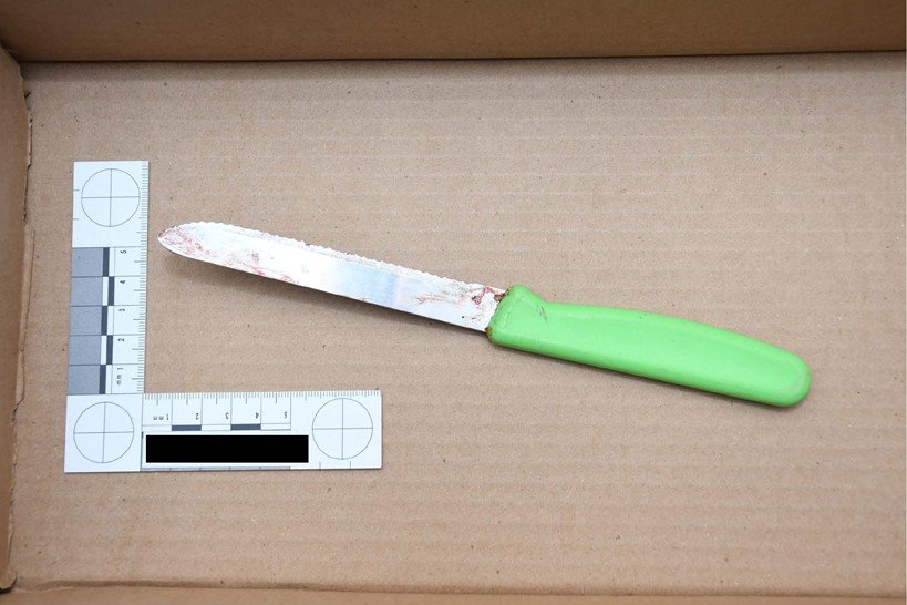 The Complainant appeared at the front of the vehicle, and WO #1 opened the driver’s door. Someone shouted, “Drop the knife.” The Complainant approached the door and WO #1 closed the door. The police officers, again, broadcast that the Complainant was running around their vehicle with a knife in his hand. The police vehicle then moved forward and made a 360-degree turn on the street.