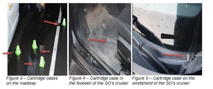 An examination of the scene yielded six firearm cartridge cases on the windshield and in the driver’s footwell of the SO’s cruiser, and on the roadway next to the driver’s door, shown by red arrows in the below images.