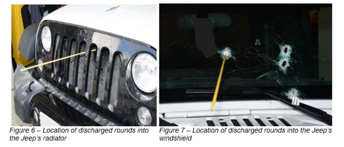 A SIU forensic investigator examined and photographed the Complainant’s Jeep and located projectile fragments inside. The images below reveal where the discharged rounds hit the Complainant’s vehicle on the front windscreen and radiator.