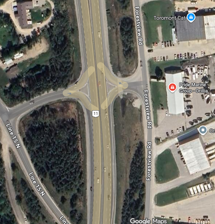 - On April 16, 2026, just before 7:30 a.m., an officer driving an OPP vehicle with emergency lights was stopped on the off-ramp to Forestview Road and partially onto Highway 11 northbound.