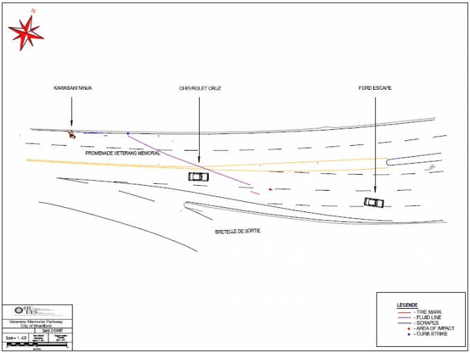 Le plaignant a accéléré vers le sud sur la rue Clarence Sud, puis vers l’ouest sur la promenade Veterans Memorial, alors que la route virait vers la droite. À un endroit situé à l’extrémité ou près de l’extrémité d’un terre-plein central qui divisait la route juste à l’ouest de l’intersection de la promenade Veterans Memorial et de l’avenue Erie, le plaignant a perdu le contrôle de sa motocyclette. Il s’est engagé sur les voies en direction est et a heurté le côté conducteur d’un véhicule qui se dirigeait vers l’est, une Ford Escape. Le plaignant a été éjecté de sa motocyclette et a heurté un autre véhicule roulant vers l’est, directement derrière la Ford Escape. Sa motocyclette est entrée en collision avec la glissière de sécurité du côté nord de la promenade Veterans Memorial et s’est immobilisée dans la voie de circulation ouest en bordure de la route.