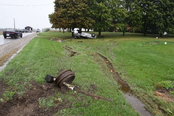 Quelques minutes plus tard, à environ un kilomètre au sud de Ridge Line, une ambulance, gyrophares et sirène allumés, approchait de la Ford en sens inverse. Au moment où l’ambulance l’a croisé, le conducteur de la Ford a fait un léger écart vers l’accotement en gravier à l’est de la chaussée, puis est retourné sur la chaussée et a perdu le contrôle de son véhicule. La Ford a glissé vers le côté est de la route, a fait deux tonneaux et s’est immobilisée sur son toit à côté d’une rangée d’arbres sur le terrain du 20113 Kent Bridge Road. Un homme est rapidement sorti de l’épave et s’est enfui vers l’est.