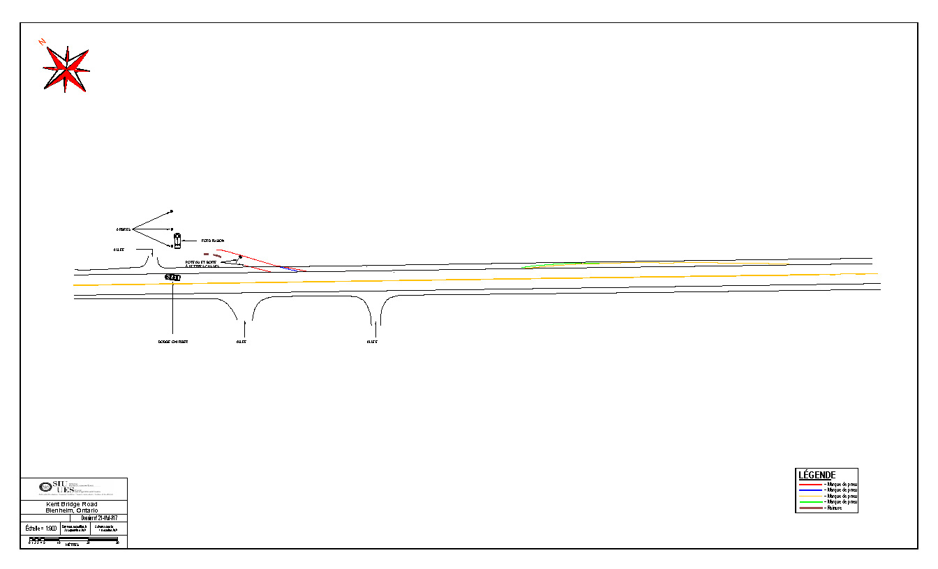 - Une Ford Fusion roulait vers le nord près du 20096 Kent Bridge Road. À environ 900 mètres au sud de Ridge Line, elle a fait un écart sur la droite et a roulé en partie sur l’accotement de gravier du côté est, sur environ 100 mètres. [Ceci correspond aux renseignements selon lesquels le conducteur de la Ford Fusion s’était légèrement déplacé sur la droite lorsqu’une ambulance l’a croisé en sens inverse.]
