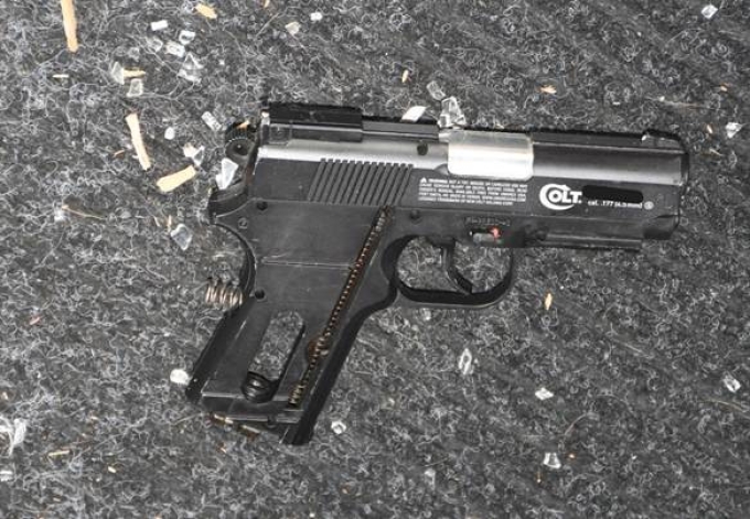 Le 19 septembre 2025, à 8 h 10, le service des sciences judiciaires de l’UES est retourné sur les lieux pour les photographier et les numériser afin de produire un schéma et pour récupérer les douilles et tracer les trajectoires des coups de feu. On a récupéré trois carabines Colt C8 du SPW pour les soumettre au Centre des sciences judiciaires (CSJ). On a trouvé 10 points d’impact de projectiles. On a déterminé qu’au total, 13 coups de feu ont été tirés. Il y avait 9 douilles près de la position signalée de l’AI no 1 sur la chaussée, 3 douilles près de la position signalée de l’AI no 2 et une douille dans la cour arrière près de la position signalée de l’AT no 3. Toutes les douilles ont été identifiées comme étant de calibre « 5.56 NATO ». L’arme à feu du plaignant (photo ci-dessous) était une réplique, plus précisément un Colt Defender de calibre .177.