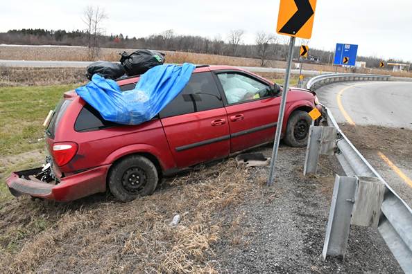 Sur les lieux, une Dodge Grand Caravan rouge accidentée était immobilisée contre la glissière de sécurité de la bretelle de sortie en direction ouest. Dans l’herbe, il y avait des marques de pneus partant de la bretelle d’accès et traversant l’aire gazonnée entre la bretelle d’accès et la bretelle de sortie. Le véhicule était immobilisé contre la partie extérieure de la glissière de sécurité métallique. Ce véhicule semblait avoir roulé en direction est sur l’autoroute 401 dans les voies de circulation en direction ouest et avoir emprunté la bretelle d’accès pour sortir de l’autoroute. Le véhicule avait roulé en sens inverse sur la bretelle d’accès en direction ouest, à grande vitesse, jusqu’à ce que le conducteur perde le contrôle et heurte la glissière de sécurité protégeant la bretelle de sortie en direction ouest.
